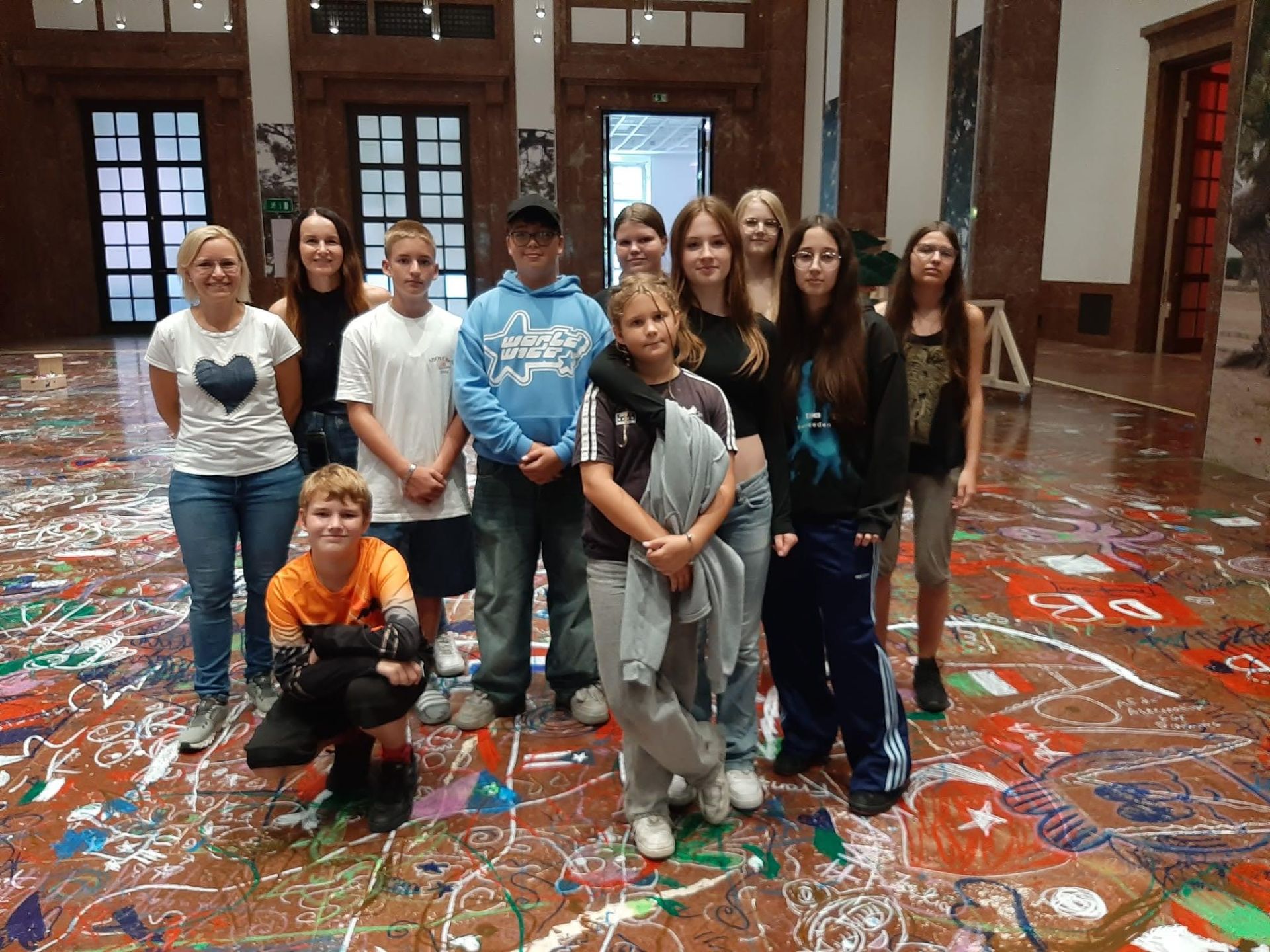 Schon beim Betreten der großen Eingangshalle war klar: Hier ist Mitmachen ausdrücklich erwünscht! Statt stiller Museumsatmosphäre erwartete die Gruppe eine große, Bodenfläche, die zum Bemalen freigegeben war. Farbe und kreative Ideen waren sofort im Einsatz und der Boden verwandelte sich noch ein wenig mehr in ein farbenfrohes Gemeinschaftswerk.