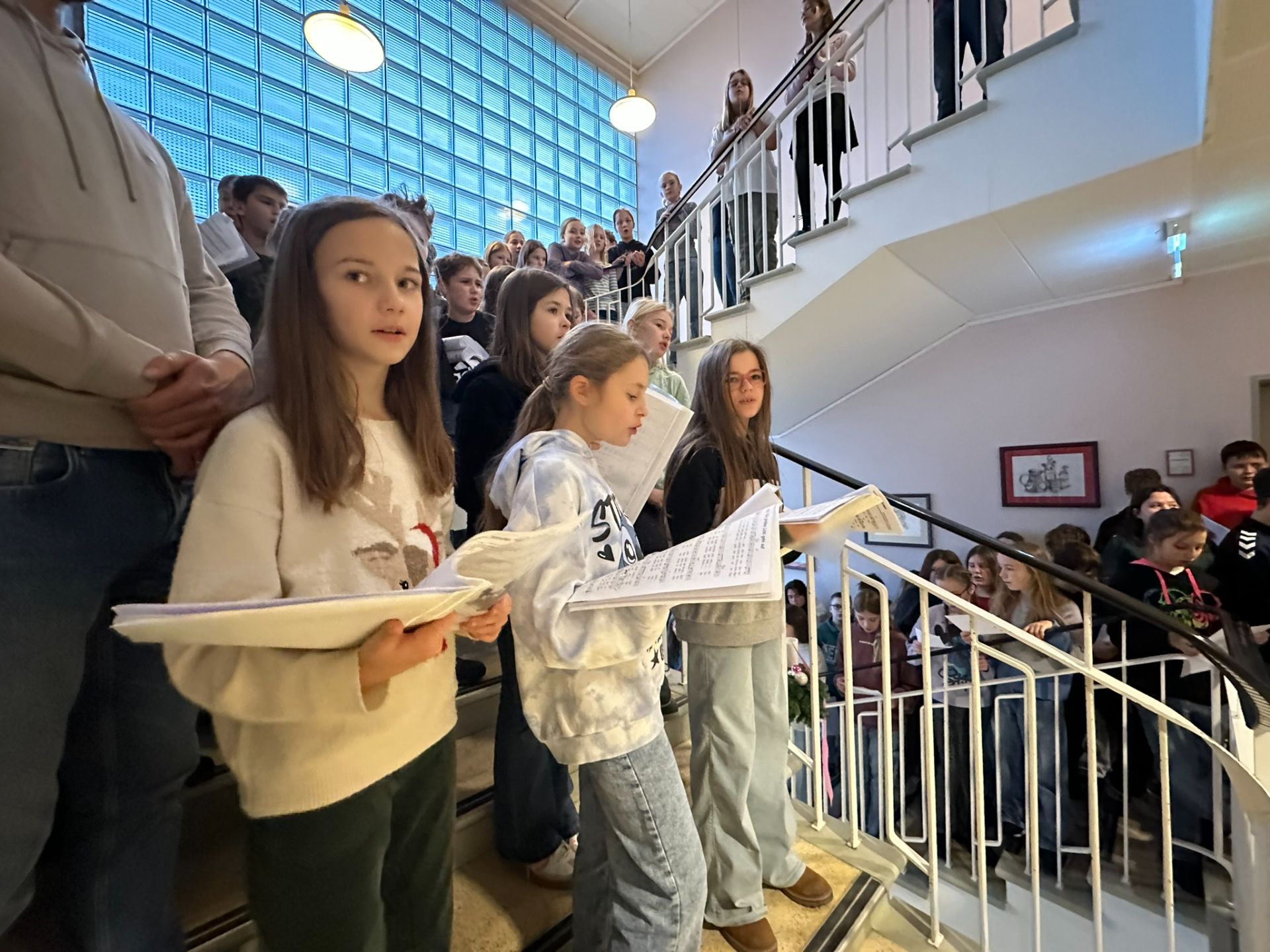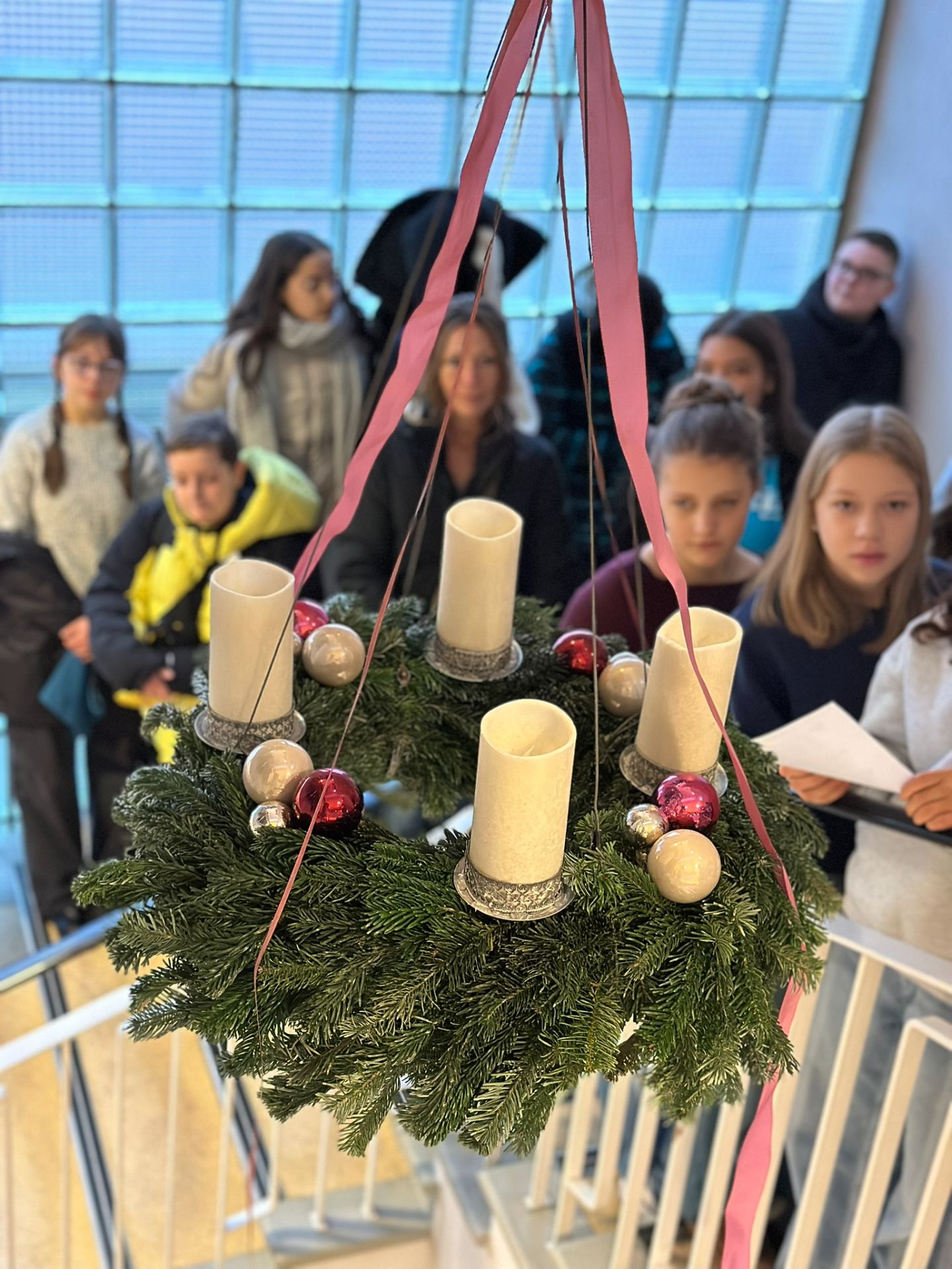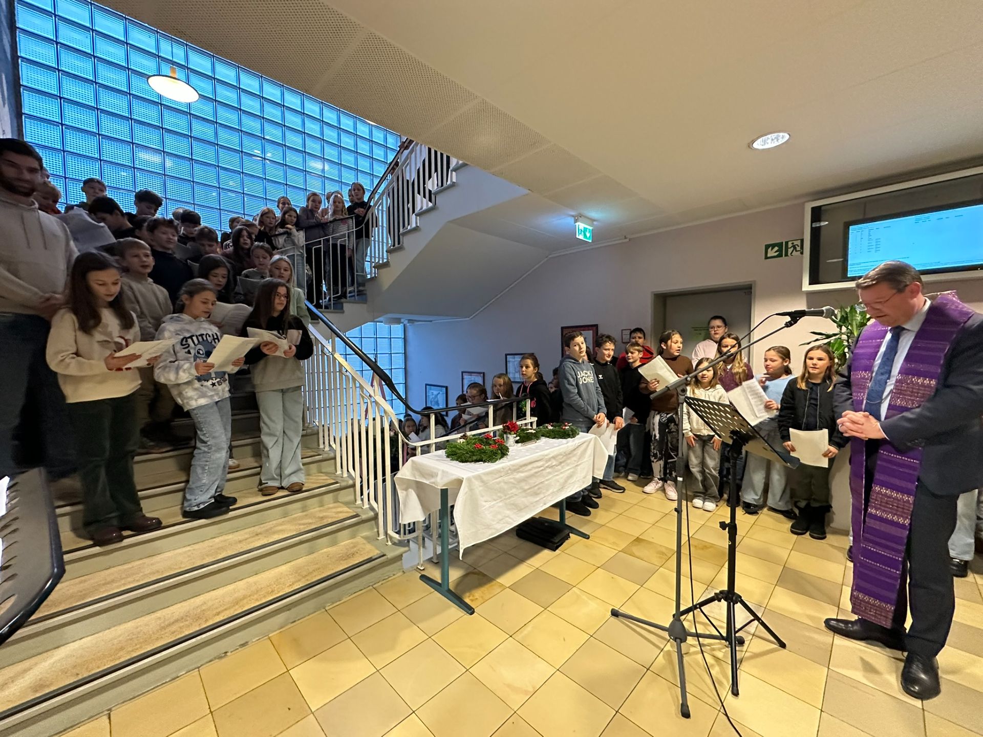 Zu Beginn der Adventszeit ist es eine schöne und wertvolle Tradition, die Häuser zu dekorieren und zu schmücken. So freut sich die Schulgemeinschaft der Realschule alle Jahre wieder über den großen Adventskranz im großen Treppenhaus, der auch heuer mit einer kleinen Feierstunde gesegnet wurde. Dazu trafen sich die Klassen 5 a, 5 b, 5 c und 6 d im Treppenhaus zusammen mit den Musik- und Religionslehrern Sandra Niebler und Bernhard Grundwürmer. Mit dabei war auch die Schulleitung mit Realschuldirektor Alexander Leibelt, Konrektor Harald Schuster und Beratungsrektorin Ines Geier. Dekan Joachim Steinfeld war gekommen, um die Bedeutung der Adventszeit und auch den Brauch des Adventskranzes zu erklären. Alle Schüler sangen gerührt „Das Licht einer Kerze“, ehe Dekan Steinfeld die eigentliche Segnung vornahm. Ministrant Matthias durfte dann feierlich (mit der Fernbedienung) die erste (LED-)Kerze entzünden. Die kurze, aber sehr feierliche und besinnliche Feierstunde endete mit dem Lied „Ein großes Licht geht auf“. Die Musiklehrer zeigten sich beeindruckt von der tollen Disziplin der weit über einhundert Schüler im Treppenhaus sowie auch von der großen Sangeskraft der Schüler in der Morgenstunde.