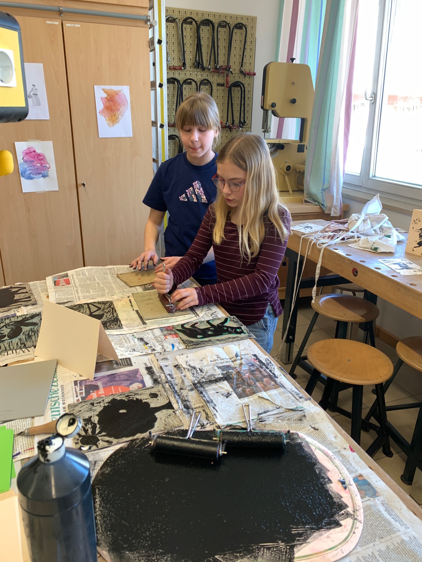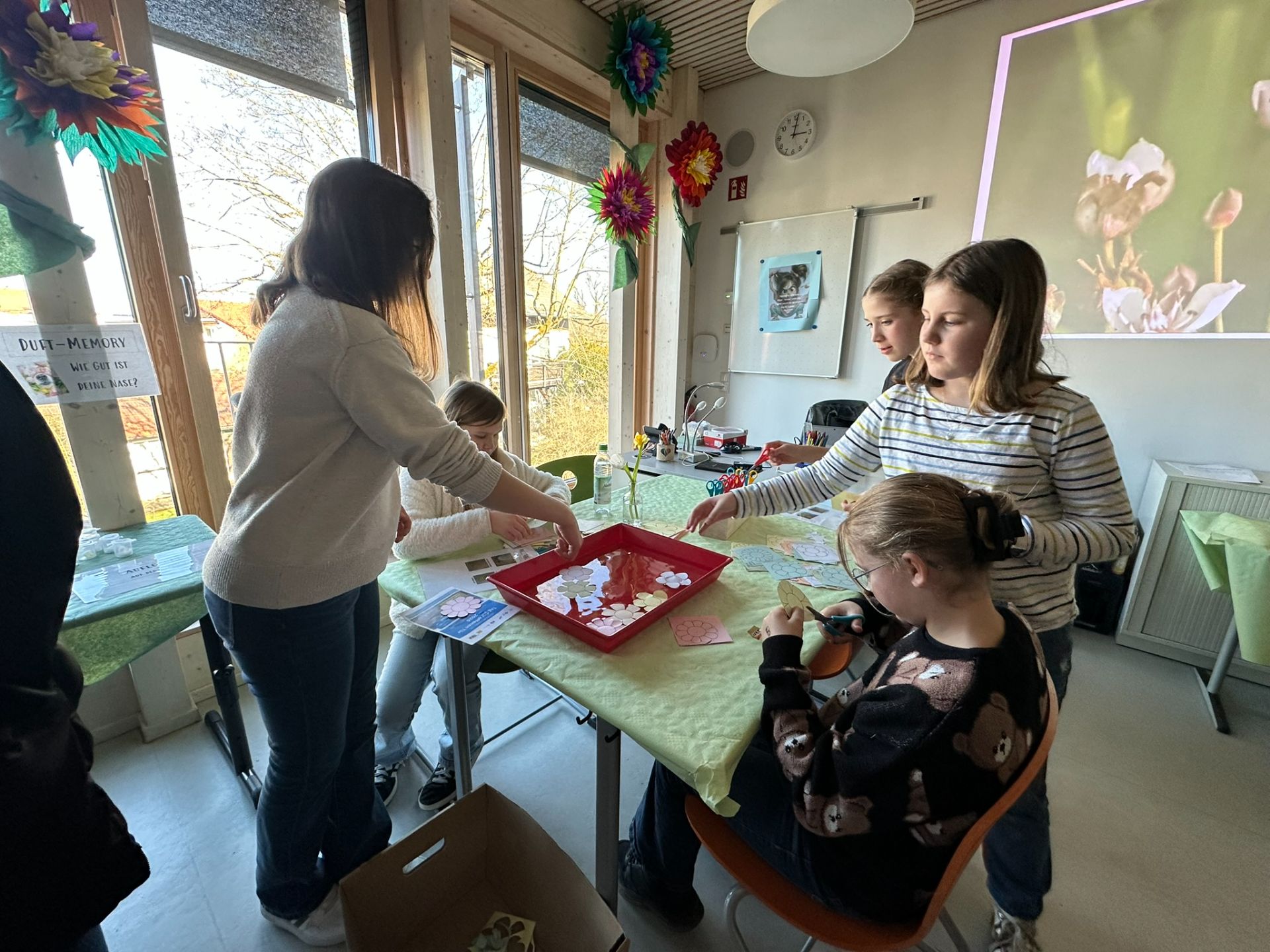 Eine Etage darüber ging das Angebot weiter im Wirtschaftsklassenzimmer. Hier konnte man auf Tablets prüfen, ob man KI-Bilder auf Anhieb erkennt. Das Fach Religion hatte eine Station aufgebaut, in der Steine zu den Themen Glück, Hoffnung, Glauben und Liebe angemalt werden sollten. Auch im Englischunterricht durfte Kreativität nicht fehlen. Hier setzten die Besucher ihre ganz eigenen englischsprachigen Kalender zusammen.