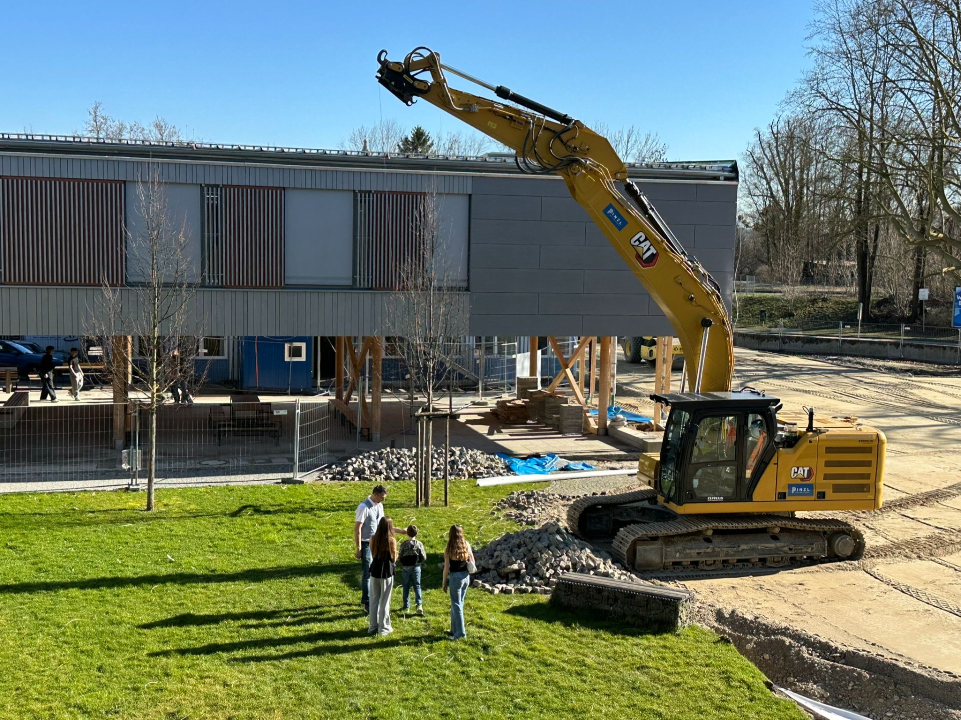 Über den Außenbereich der Schule gelangte man zu den Containern. Dort befindet sich der IT Raum, auf Computern konnten die Besucher Tipp- und Maustrainings aus dem Unterricht ausprobieren. Gleich daneben lieferte eine Sonderausstellung Informationen zum Neubau der Schule. Neben zwei kurzen Videos zum Abriss des Gebäude aus den 60er Jahren und dem Bau des neuen Schulgebäudes, waren die Baupläne auf großen Tischen präsentiert. Lehrerin Nicole Stöger und Thomas Klobeck vom Landratsamt informierten die Neugierigen. Thomas Klobeck betreut das Projekt seit 2019 und sagt: „Der Bau verläuft problemlos, der größte Aufwand besteht bei der Entsorgung.“ Nach seinen Angaben soll der dritte und letzte Bauabschnitt 2027 fertiggestellt werden.