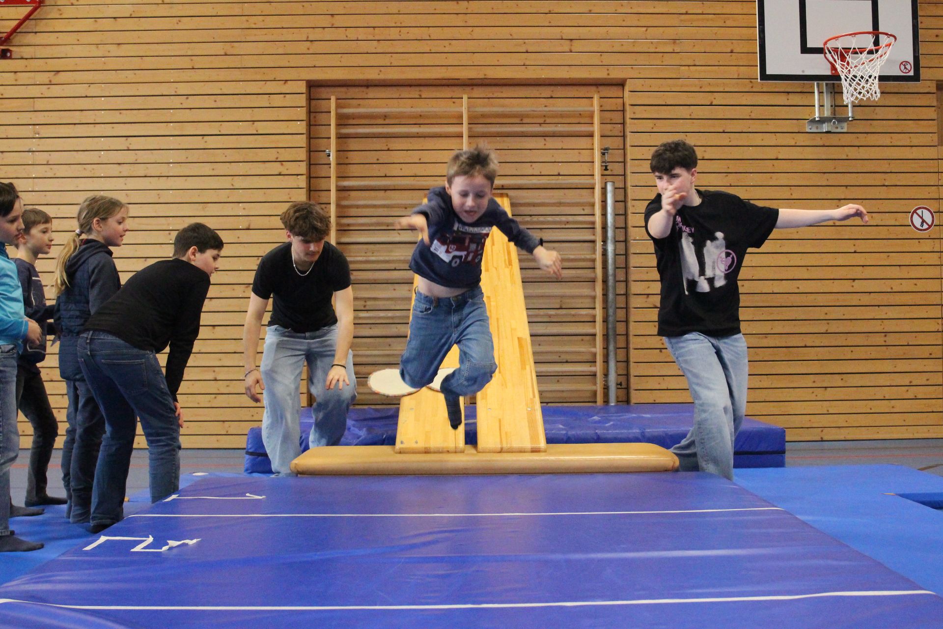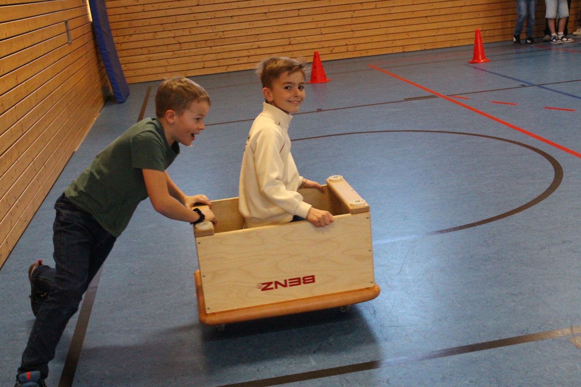 In der Turnhalle im Untergeschoss konnten die Kinder in einem Parcours verschiedene Disziplinen – ganz wie bei den Olympischen Spielen – testen wie Bobfahren und Skispringen, Eishockey und Skialpin (Slalom). Ein absolutes Highlight war das Fußballtor, welches die Geschwindigkeit des Balles bei einem Treffer maß.