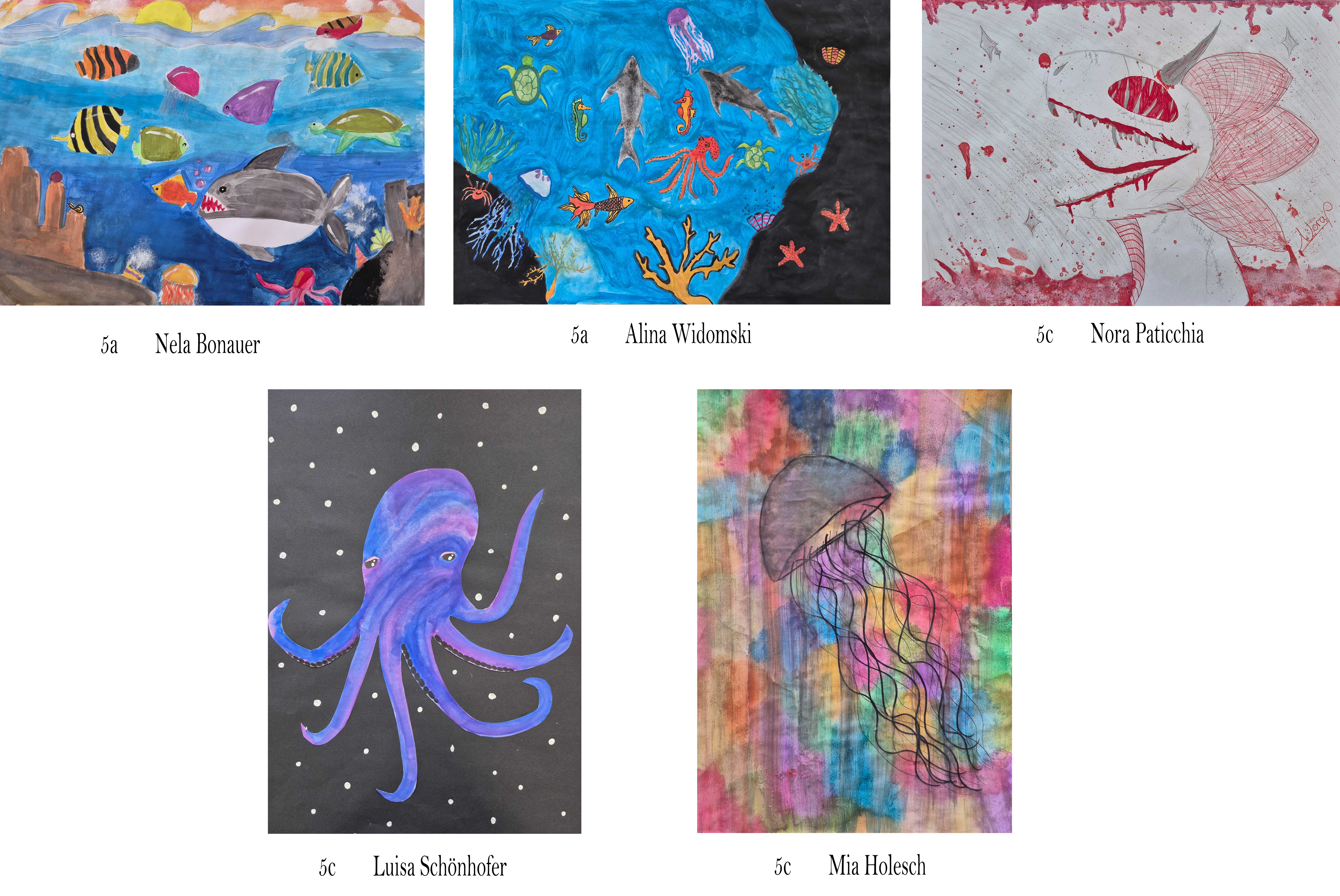 Quallen, Seeungeheuer, Tiefsee – die Motive, mit denen die Schülerinnen und Schüler sich zum Thema „Meer entdecken“ waren außergewöhnlich und vielfältig. Leuchtende Fische, Korallen oder Taucher, die sich in der Welt des Meeres umsehen, kamen auf dem zumeist dunkelblau gewähltem Grund gut zur Geltung. Aber auch Zeichnungen mit Fineliner, Kreide oder Collagen zogen die Blicke der Jurymitglieder auf sich und überzeigten letztlich als Gewinnerbilder. Drei Schüler gingen durch die Wahl des Materials „Plastik“, das sie zur Gestaltung nutzen, auch indirekt auf die Müll-Problematik in unseren Meeren ein.