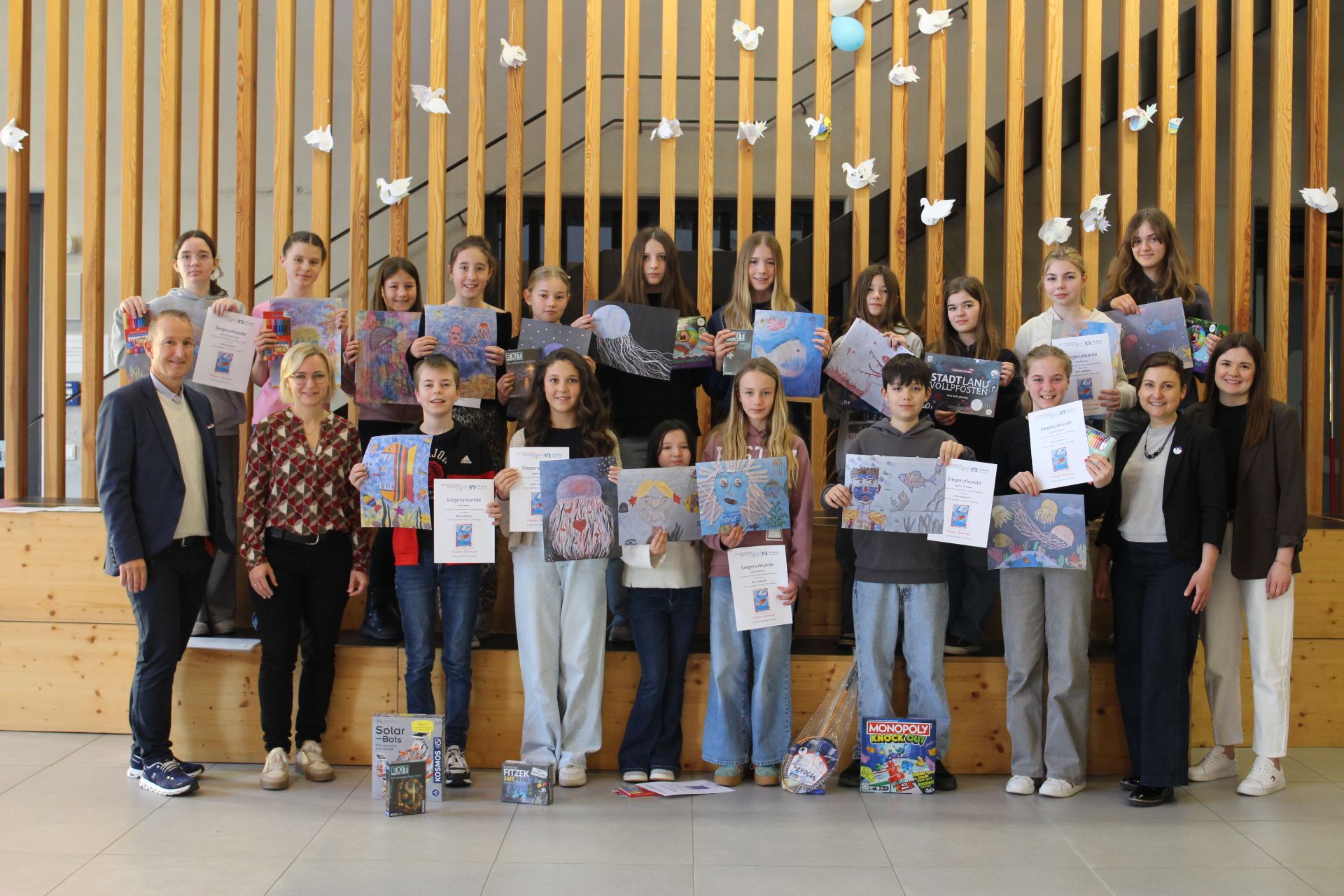 Die Jury, die aus Anne Ritter, Heike Sonnleitner, Alexander Leibelt und Sylvia Bühler bestand, stellten gemeinsam fest, welche Bilder der 5.-6. Jahrgangsstufe, welche am Wettbewerb teilnahmen, die eindrucksvollsten sind. Preisgekrönt wurden die Sieger dann von Frau Elisabeth Schmid sowie Frau Magdalena Schmid, die im Namen der VR-Bank zusammen mit Schulleiter Alexander Leibelt und Sylvia Bühler die Preisverleihung vornahmen. Die Gewinner freuten sich über Urkunden sowie interessante, kreative Spiele oder Zeichenmaterialien, die sie als Preise für ihre kleinen Meisterwerke erhielten. Mit Dank über diese und Vorfreude auf die weitere Teilnahme an künftigen Malwettbewerben verabschiedete sich das Team der VR-Bank. Anbei eine Übersicht über die Kunstwerke.