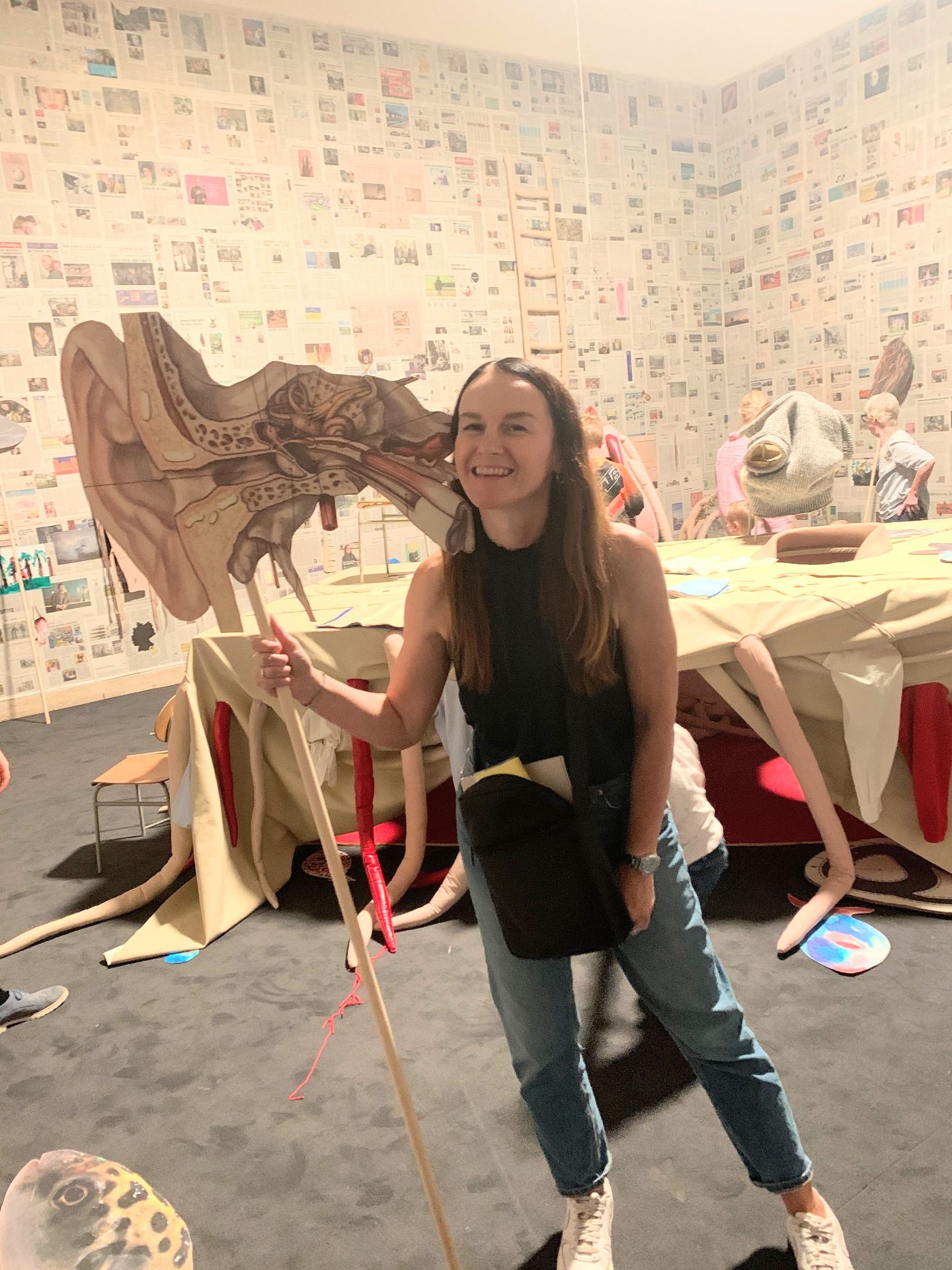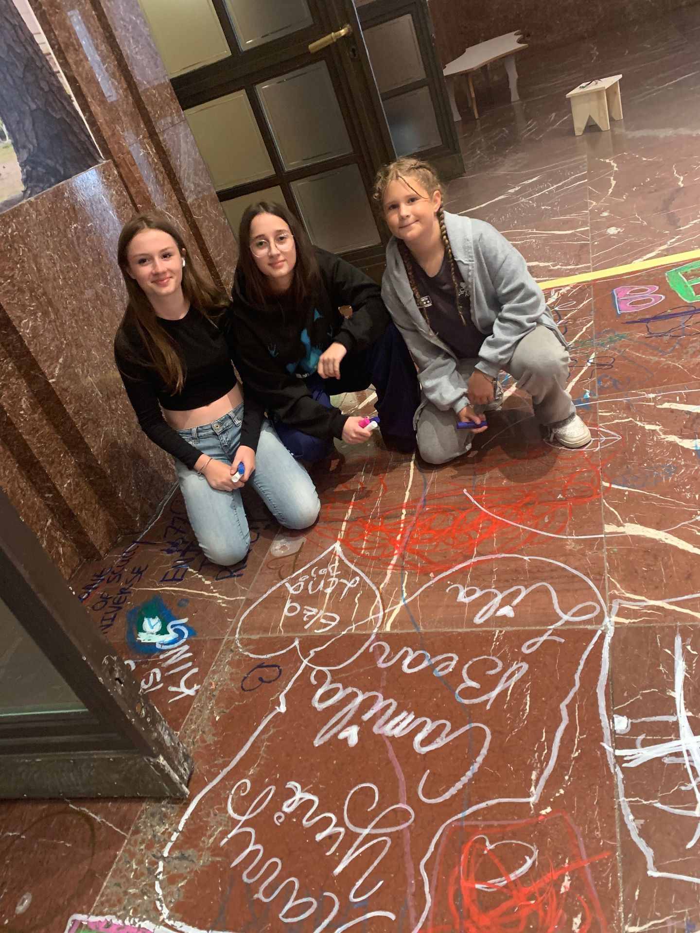 Schon beim Betreten der großen Eingangshalle war klar: Hier ist Mitmachen ausdrücklich erwünscht! Statt stiller Museumsatmosphäre erwartete die Gruppe eine große, Bodenfläche, die zum Bemalen freigegeben war. Farbe und kreative Ideen waren sofort im Einsatz und der Boden verwandelte sich noch ein wenig mehr in ein farbenfrohes Gemeinschaftswerk.
