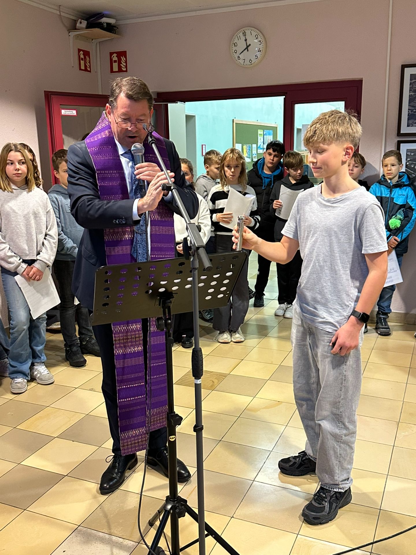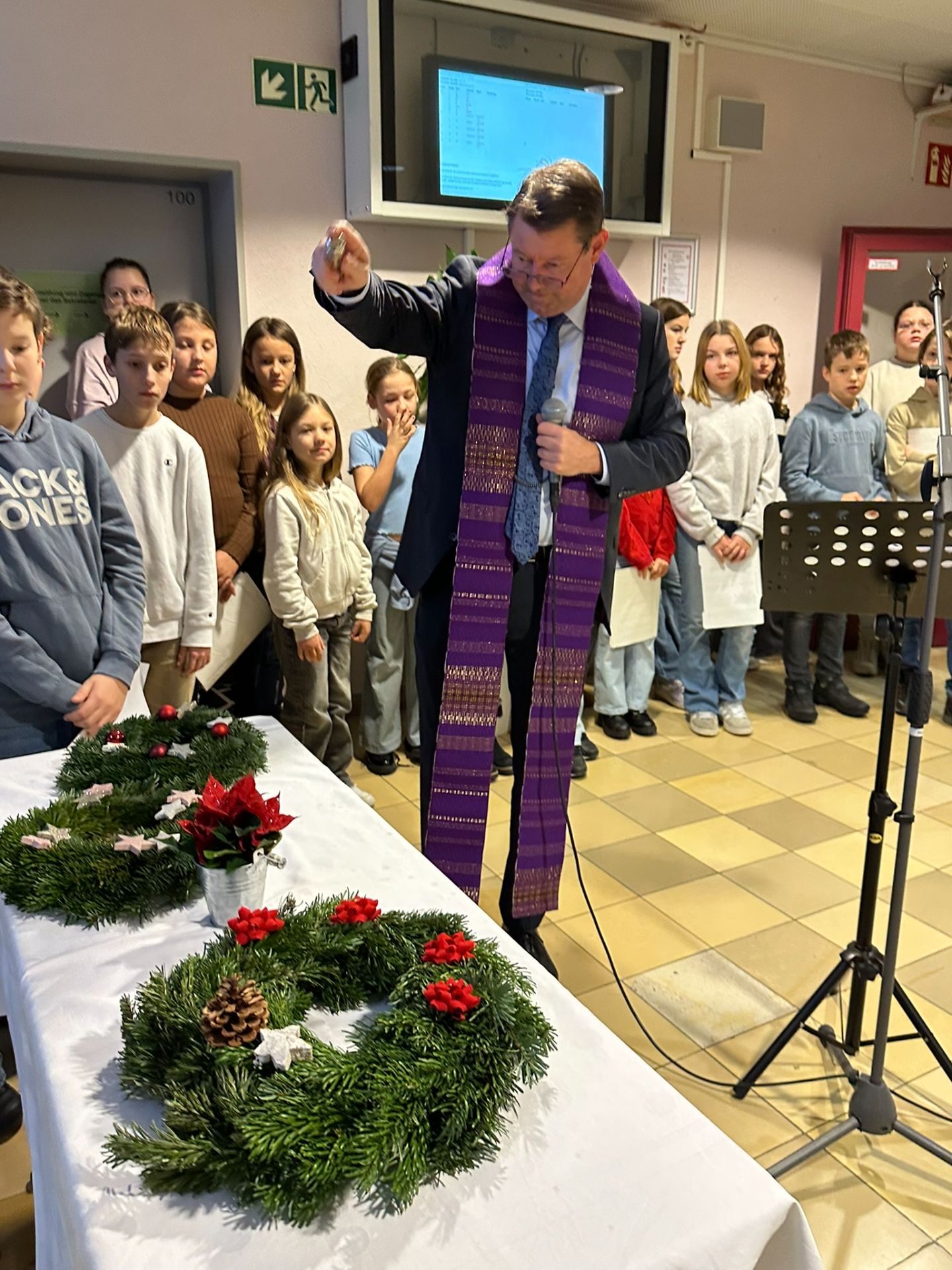 Zu Beginn der Adventszeit ist es eine schöne und wertvolle Tradition, die Häuser zu dekorieren und zu schmücken. So freut sich die Schulgemeinschaft der Realschule alle Jahre wieder über den großen Adventskranz im großen Treppenhaus, der auch heuer mit einer kleinen Feierstunde gesegnet wurde. Dazu trafen sich die Klassen 5 a, 5 b, 5 c und 6 d im Treppenhaus zusammen mit den Musik- und Religionslehrern Sandra Niebler und Bernhard Grundwürmer. Mit dabei war auch die Schulleitung mit Realschuldirektor Alexander Leibelt, Konrektor Harald Schuster und Beratungsrektorin Ines Geier. Dekan Joachim Steinfeld war gekommen, um die Bedeutung der Adventszeit und auch den Brauch des Adventskranzes zu erklären. Alle Schüler sangen gerührt „Das Licht einer Kerze“, ehe Dekan Steinfeld die eigentliche Segnung vornahm. Ministrant Matthias durfte dann feierlich (mit der Fernbedienung) die erste (LED-)Kerze entzünden. Die kurze, aber sehr feierliche und besinnliche Feierstunde endete mit dem Lied „Ein großes Licht geht auf“. Die Musiklehrer zeigten sich beeindruckt von der tollen Disziplin der weit über einhundert Schüler im Treppenhaus sowie auch von der großen Sangeskraft der Schüler in der Morgenstunde.