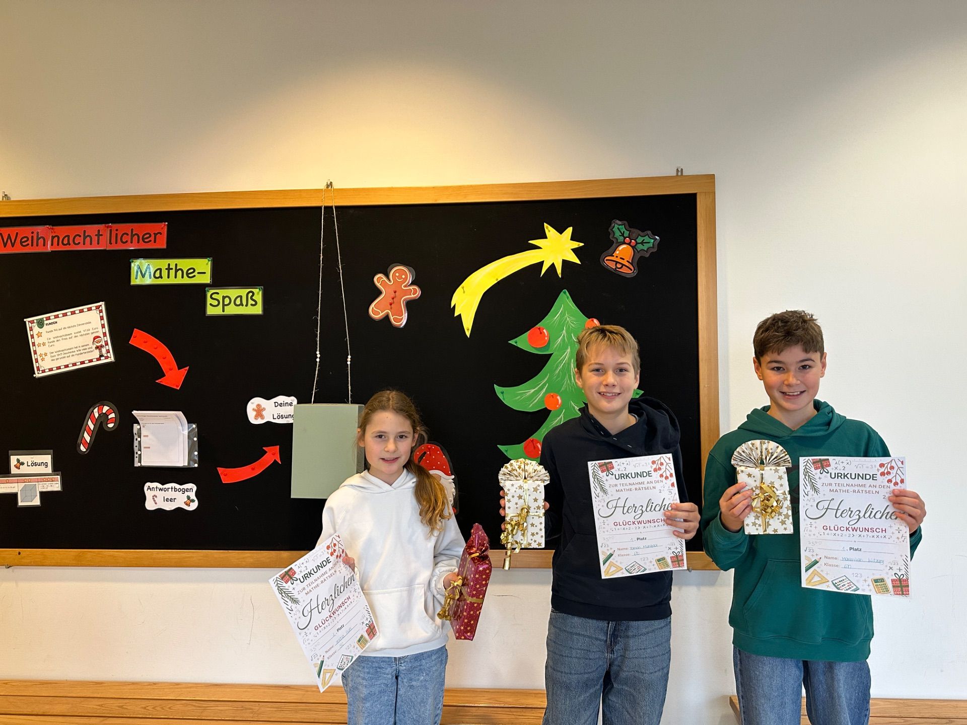 Als zusätzliche Motivation wurden die drei besten Teilnehmenden am Ende des Adventskalenders mit Preisen ausgezeichnet. Über Logikspiele als Anerkennung für ihre Leistungen freuten sich Helena Auer (Klasse 5 c), Fabian Mühlböck (Klasse 6 b) und Maximilian Witzany (Klasse 6 b).