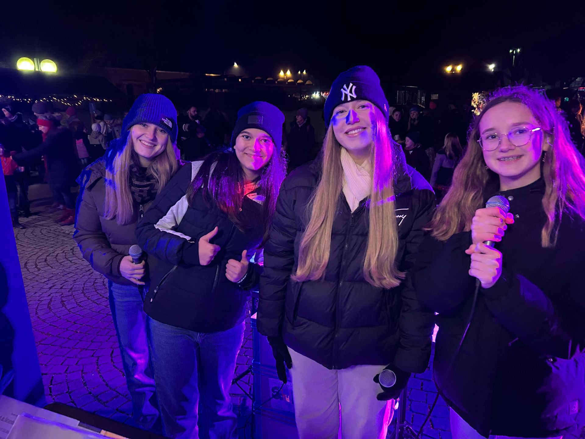 Und dann war es so weit: Hunderte Schüler und Eltern der Grundschule strömten in den Pausenhof, der vom Elternbeirat der Grundschule mit Feuerschalen und vielen Verkaufsständen liebevoll dekoriert worden war. Sogar einige Foodtrucks sorgten für das leibliche Wohl. Die Sängerinnen Jana, Patrizia und Laura begannen fröhlich mit den Swing-Klassikern „Winter Wonderland“ und „Let It Snow“. Und sofort fanden sich viele Besucher, die um die Schulband herum ein großes Publikum bildeten. Durch die tolle Lichtanlage war die Band in buntes Licht gehüllt. Was für ein stimmungsvoller Auftritt! Jonas, Lukas und Tim am Schlagzeug und an den typischen „Christmas Chimes“ sorgten für den richtigen Rhythmus. Gitarrist und Leiter Bernhard Grundwürmer war richtig begeistert: „Besonders freut es mich, dass mit E-Bassist Lukas Schiefeneder und Sängerin Elina Esterbauer zwei ehemalige Realschüler die Schulband unterstützten, da viele Schulbandmitglieder wegen der vorweihnachtlichen Terminflut absagen mussten.“