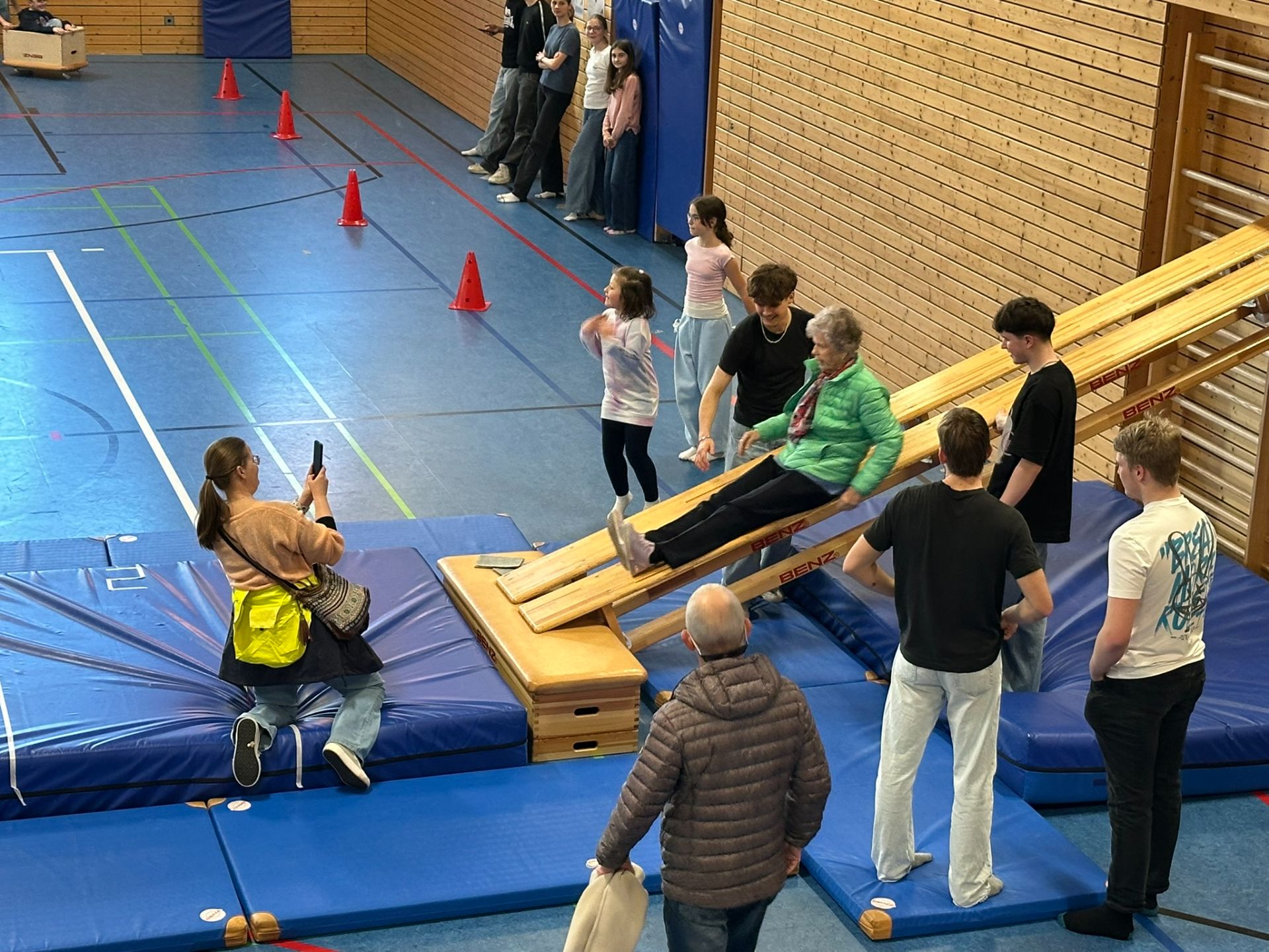 In der Turnhalle im Untergeschoss konnten die Kinder in einem Parcours verschiedene Disziplinen – ganz wie bei den Olympischen Spielen – testen wie Bobfahren und Skispringen, Eishockey und Skialpin (Slalom). Ein absolutes Highlight war das Fußballtor, welches die Geschwindigkeit des Balles bei einem Treffer maß.