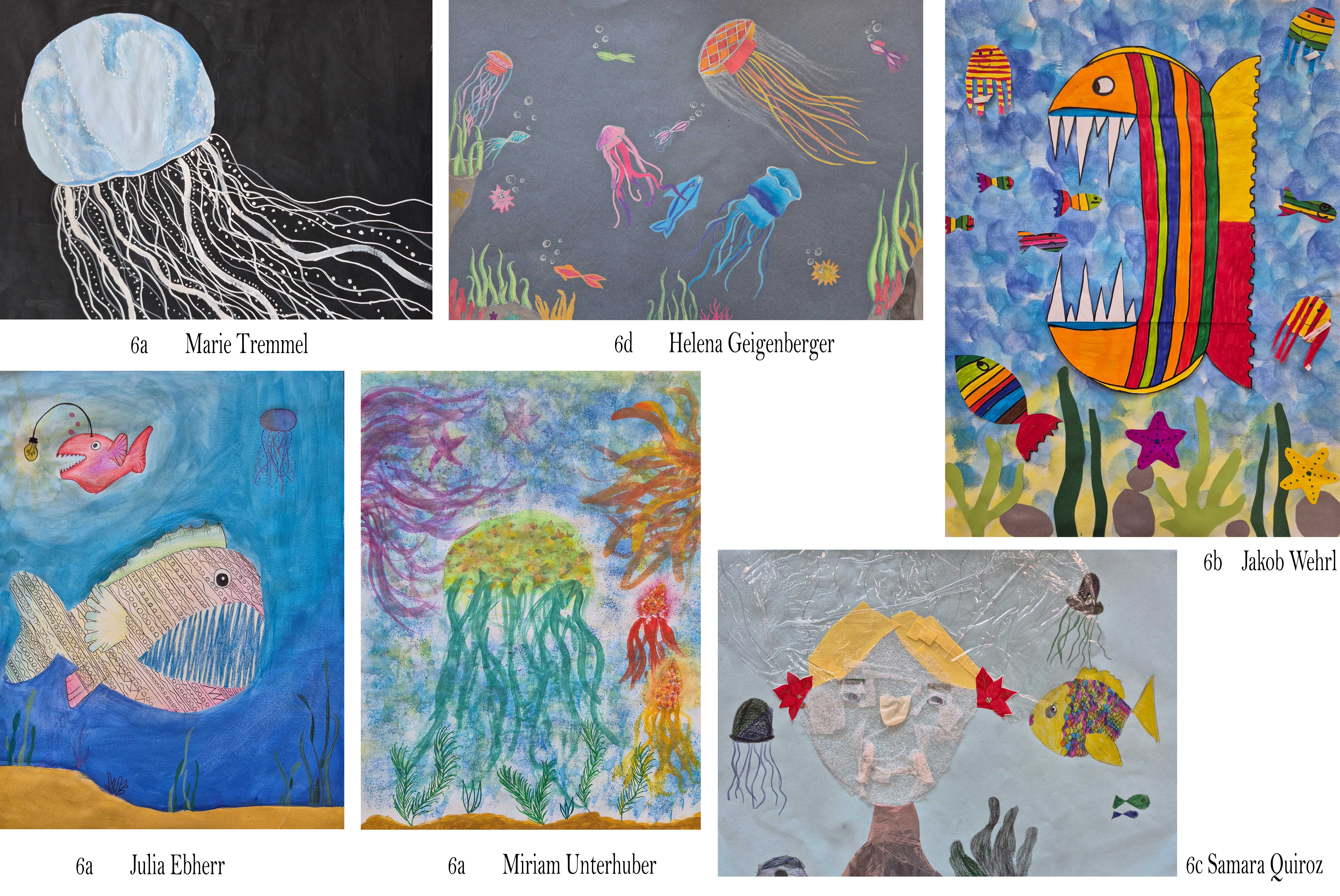 Quallen, Seeungeheuer, Tiefsee – die Motive, mit denen die Schülerinnen und Schüler sich zum Thema „Meer entdecken“ waren außergewöhnlich und vielfältig. Leuchtende Fische, Korallen oder Taucher, die sich in der Welt des Meeres umsehen, kamen auf dem zumeist dunkelblau gewähltem Grund gut zur Geltung. Aber auch Zeichnungen mit Fineliner, Kreide oder Collagen zogen die Blicke der Jurymitglieder auf sich und überzeigten letztlich als Gewinnerbilder. Drei Schüler gingen durch die Wahl des Materials „Plastik“, das sie zur Gestaltung nutzen, auch indirekt auf die Müll-Problematik in unseren Meeren ein.